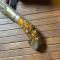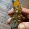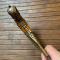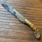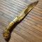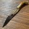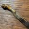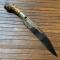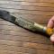 Lame forgé à simple tranchant avec cartouche a inclusion de laiton ciselé, feuilles d'argent à décor repoussé à la base de la lame , plaque argent à motifs géométriques au dos de la lame continuant sur le pourtour du manche. Belle Plaquettes en IVOIRE joliment teintées et finement sculpté inclusions laiton argent , pommeau finement ciselé.