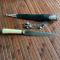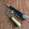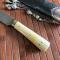 BEAU couteau Ottoman à poignée en ivoire avec frise de feuillages à l'or . Lame de 19 cm damas Wootz à simple tranchant. Fourreau en bois recouvert de cuir à deux garnitures en argent ciselé avec ses pendeloques argent.