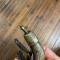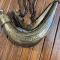 Ancien et rare Pulvérin a bassiné à poudre forme coudé en laiton ciselé, avec deux chaînettes de suspension pour le transporter . Bec à ressort parfaitement fonctionnel.