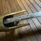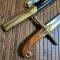 BEAU SABRE D'OFFICIER A LA MAMELOUK Poignée crosse pistolet à plaquettes en bois avec œillet de dragonne en laiton guilloché en bordure, monture à l'oriental en laiton, garde à deux quillons droits finissant en olive et oreillons. Lame courbe, gravée de motifs cabalistiques, FLEURS DE LYS. Contre-tranchant . MARQUAGE KLINGENTHAL AU DOS DE LA LAME .