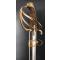 Monture en laiton doré, garde à la chasseur à trois branches unies en laiton doré du modèle de l'An IX, fusée de bois recouverte de cuir filigranée, calotte à longue queue renforcée à sa base, croisière à double oreillons terminée par un quillon recourbé en forme de boule. Forte lame de 86cm se terminant en langue de carpe, hameçon formé sur le contre tranchant, belle coloration d'origine dorée et bleuie sur la moitié, gravée sur chaque face d'un trophée, d'un hussard chargeant surmonté de la banderole "Vivat hussard", talon orné d'un soleil rayonnant, l'un des hussards porte un shako orné d'une aigle impériale. Fourreau de fer poli, à deux bracelets de bélières en laiton anciennement doré se terminant par un bourrelet, longueur 102 cm.