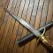 Manche en beau bois de chevreuil,croisière à deux quillons en S en laiton lame à pans et double tranchant . Dans un fourreau en cuir bouterole laiton