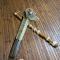 Lame Yatagan légèrement courbe agrémentée de frise gravé et incrustation de laiton ,belle lame très effilée et très tranchante à simple tranchant dos plat , poignée traditionnelle en laiton ciselé travaillée de forme zoomorphe canidé , fourreau en bois noyé sculpté sur une face , liens postérieurs .