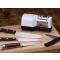 2 étapes (module 1 : affûtage électrique, module 2 : micro-affilage manuel), équipé d'une surface abrasive diamantée qui assure un résultat maximal et d'un guidage magnétique qui lors des étapes de l'aiguisage donne l'angle idéal à la lame.