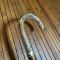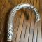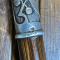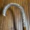 Pommeau courbé entièrement en argent 800/1000 finement ouvragée de motifs,avec monogramme gravé en lettre gothiques. On retrouve 4 ou 5 poinçons argent et orfèvre