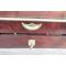 Excellent coffret de 460 x 265 x 80 mm. Les 8 angles sont renforcés de coins en laiton, les arêtes supérieures sont renforcées par une baguette laiton et un filet laiton suit parallèlement. Au centre une plaque laiton avec les initiales du propriétaire de l'époque "AU". Sur la face avant se trouve une serrure avec sa clef, ainsi qu’un onglet pour la manœuvre du couvercle. Compas d'ouverture pour le maintien ouvert du couvercle. L'état extérieur est assez bon, juste une petite fente recollée vers l'arrière.
