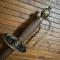 Fusée entièrement filigrané en cuivre rouge tressé en chevrons, bague en argent décoré de motifs floraux , pommeau ovoïde à bouton de rivure. Montre en bronze décors torsadé, garde à une branche et pas d'âne .