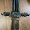 Garde à deux quillons terminés en tête de chien de chasse, croisière à écusson centrale à la hure de sanglier sur une face, et tête de cerf sur l'autre.