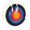 Petite cible en paille avec tissu brillant et ruban pour l'accrocher.
