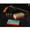 Ma reproduction (photos 3, 4 et 5) a été réalisée à partir de la photo noir et blanc de l’étiquette d’une boîte authentique (photo 2) publiée dans l'ouvrage magistral de Charles W. Pate, Smith & Wesson American Model in U.S. and Foreign Service. L'étiquette de cette boîte comporte la mention RUSSIAN MODEL en lettres rouges. En effet, lors de la création du Smith & Wesson Russian, U.M.C. utilise d'abord les étiquettes destinées aux boîtes du modèle American en les surchargeant à l'aide de ce tampon avant de créer une boîte spécifique pour le modèle Russian.