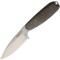 Longueur totale 19,05cm. Longueur de lame 8,89cm, Lame en acier N690 finition stonewash. Plaquettes du manche en micarta Green linen. Construction d'une seule pièce - Full Tang. Trou dans le manche pour dragonne. Affutage de type sabre. Etui cuir marron. Made In USA