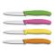 Boîte de 20 couteaux office, lame crantée 8 cm inox, pointe milieu, manche polypropylène assortis (5 de chaque couleur : vert, rose, jaune, orange). Livrés par boîte de 20 uniquement et facturés à la boîte.