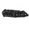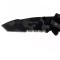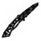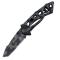 Lame semi-crantée en acier 420HC (dureté 58HRC) de forme Tanto avec un revêtement noir camouflage et ouverture par ergot de pouce. Manche acier inoxydable avec des trous comme un squelette donc très léger.