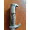 Je vends cette baïonnette ww2 de la Schutzpolizeï allemande. Je l'ai trouvé tel quel dans un vide maison en Alsace. Il n'y a hélas, ni fourreau, ni gousset ni dragonne. Son nickelage est présent à 90%. Les plaquettes en bois de cerf sont très belles, le pommeau en tête d'aigle est très beau. Le bouton de verrouillage est fonctionnel, les les feuilles de chêne sur la garde bien présentes idem pour l'écusson de la SP. Elle fut fabriquée par Clémen & Jung comme en atteste le marquage fabriquant. Elle dispose d'un numéro frappé sur le croisillon S.F 27. Une belle pièce à exposer en vitrine.