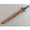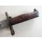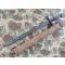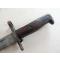 Baïonnette US M1905 du 1er contrat (1905/1922) pour fusil Springfield 1903 et fusil Garand M1. Cet exemplaire a été fabriqué par Springfield Arsenal (SA) en 1906, n° de matricule 174855. Cet exemplaire est encore en très bon état et les photos participent à sa description. Lame sans dent, sans choc et sans trace d’affutage, avec de légères marques d’oxydation par endroits. Très beaux marquages sur le plat de lame, plaquettes d’origine en bon état, aucun jeu dans la poignée et système de verrouillage fonctionnel. Le fourreau est un modèle US M1910 en bois/peau/web. Ce modèle restera en dotation jusqu’au début de la WW2. Il est encore en bon état mais la chaussette en web à perdu sa partie cuir située normalement à l’extrémité. Sinon le fourreau bois/peau et le reste du web sont en très bon état pour leur âge (plus de 110 ans). Un nom au dos du fourreau, PAUL DROWN.