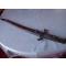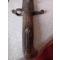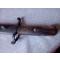 Poignée de cuir noir quadrillé, fixation par 3 et 4 rivets. Fourreau très bon état sauf la couture , extrémité repeinte ?
