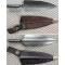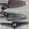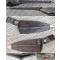 Douille à deux fentes avec système de verrouillage interne pivotant à 45°. Lame large en forme de pelle pointue, avec face interne concave et face externe dotée d'une nervure centrale séparant deux pans, et, affutée d'usine sur la moitié inférieure gauche. Finition d'origine poli brillant pour la lame et bleui foncé pour la douille. Sans la poignée/manche en bois amovible (pour utilisation manuelle sans fusil). Avec fourreau en fer recouvert de cuir à embout laiton, à couture de chaque côté avec bourrelet proéminent interne pour arrête du dos de la lame.