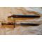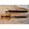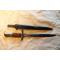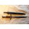 Baïonnette Suisse mle 1918. Plaquettes bois, bouton fonctionnel, croisière au N° 51 , Croix Suisse et 662796.. Lame de 30cm à double tranchant , marquage Waffenfabrik Neuhausem – Les parties métalliques semblent nickelées. Fourreau fer bronzé sans numéro. Sanglon avec petite coupure. Très bon état général. La K98 de la dernière photo n'est pas comprise dans la vente.