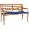 Banc Batavia avec coussin bleu royal 120 cm Bois de teck massifCe banc Batavia en bois confortable et élégant ajoutera une touche de charme rustique à votre jardin ou terrasse. Fabriquée en bois dur de teck extrêmement durable, cette pièce de meuble en teck a été chevronnée, séchée au four puis finement poncée pour lui donner un aspect très lisse. Le bois de teck est connu pour sa résistance exceptionnelle aux intempéries, ce qui le rend bien plus adapté aux meubles de jardin que tout autre type de bois. Le bois de teck est le choix idéal si vous souhaitez acheter une pièce de meubles de jardin durable. Grâce à la surface poncée, le banc de jardin est résistant aux intempéries et facile à nettoyer. Il est également très approprié pour vous détendre ou dîner avec vos amis ou votre famille. Le coussin inclus est pratique et a une fonction décorative. Maximum 110 kg par siège. Soyez conscient du risque de feu ouvert et d'autres sources de forte chaleur à proximité de l'appareil.
