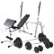 Il comprend deux disques d'haltères de 15 kg, deux disques d'haltères de 10 kg, deux disques d'haltères de 7,5 kg, quatre disques d'haltères de 5 kg, six disques d'haltères de 2,5 kg, six disques d'haltères de 1,25 kg, deux barres à disques d'haltères et deux barres d'haltères et a un poids total d'environ 120 kg.