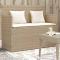 Banc de jardin avec coussins beige résine tresséeCe banc de jardin n'est pas seulement un siège d'extérieur, il est aussi parfaite pour garder vos coussins de meubles d'extérieur, fournitures de jardinage, serviettes de piscine et d'autres articles organisés et facilement accessibles. Matériau durable : la résine tressée, également connue sous le nom de poly rotin, est un matériau synthétique solide et nécessitant peu d'entretien qui ressemble au rotin naturel. Il est léger, facile à nettoyer et couramment utilisé pour les meubles d'extérieur en raison de sa durabilité et de ses propriétés de résistance aux intempéries.Fonction de rangement avec sac résistant à l'eau : le mobilier de jardin dispose d'un espace de rangement sous l'assise, complété par un sac résistant à l'eau pour ranger coussins, jouets et autres objets. Le sac intérieur peut être solidement fixé au mobilier d'extérieur grâce à des attaches auto-agrippantes pour plus de stabilité.Expérience d'assise confortable : ce mobilier d'extérieur, doté d'un coussin épais rembourré, offre une expérience d'assise confortable.Sécurité et facilité d'ouverture et de fermeture : le ressort à gaz facilite l'ouverture du couvercle et l'empêche de claquer ou de coincer les doigts.Housse amovible et lavable : ces coussins de siège sont dotés de housses amovibles pour un lavage et un entretien faciles. Bon à savoir :Pour que vos meubles d'extérieur restent beaux, nous vous recommandons de les protéger avec une housse imperméable. Maximum 110 kg par siège. Soyez conscient du risque de feux ouverts et d'autres sources de forte chaleur à proximité du produit.