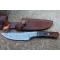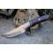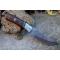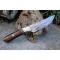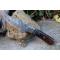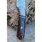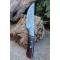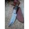 Skinner damas - Longueur du manche 10cm - Longueur de la lame 9.5cm - Lame en Acier damas 256 couches - Damas bubble - Lame de type trailing point - Construction d'une seule pièce - Full tang - Plaquettes du manche en bois de rose - Mosaic pins - Mitres en damas - Fabrication Artisanale - Les dessins de la lame sont uniques comme une empreinte - Etui cuir