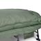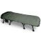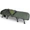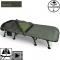Le bedchair est construit en acier et en aluminium pour le cadre avec un profil 100 % plat. Les pieds sont écartés pour un profil bas et chaque pied est doté d'une section courte pour plus de solidité et de sécurité. Les pieds sont réglables via le mécanisme de pieds Grip-Lok(TM), permettant un réglage facile et sécurisé de la hauteur. Les pieds sont également renforcés avec des tubes doubles, qui ont tous de grands pieds pivotants. Les charnières doubles pliées donnent au lit un profil complètement plat et laissent suffisamment de place pour que le système de couchage se replie de manière plus compacte. Tous les boulons, rondelles et fixations sont en acier inoxydable, ce qui ajoute légèreté et solidité. Enfin, il y a deux poches de rangement latérales pratiques pour un téléphone ou des clés de voiture.