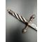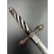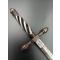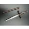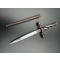 Très belle dague de vertu entièrement en acier forgé dans la style de Violet le Duc. Ces dagues, encore appelèes "pique couilles" permettaient aux femmes dites de "petite vertu" de se défendre et étaient portées glissé dans la jatterière. lame à double tranchant anec arête médiane mesurant 12,5 cm. garde à double quillon et intéressante fusèe en méta l torsadé (probablement argent) autour de la soie. Fourreau en acier avec bélière. Longueur totale 22,5 cm. Très belle et intéressante petite dague romantique en très bel état.
