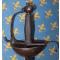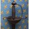 Superbe rapière à "Taza" forte et belle lame triangulaire à trois pans creux avec un nerf bien présent (lame flexible se redressant parfaitement lorsque l'on cesse de la ployer). Arme montée fer, lèvre de la taza se prolongeant en branche de garde unique visée sur le pommeau, deux quillons longs et inversés complétant la défense de la main en plus de la taza couvrante hémisphérique. Fusée en navette habillée d'un double filigrane de fer en chevrons inversés, la dite fusée est décaissée de 4 gorges longitudinales dans lesquelles le filigrane est inséré. pommeau ovale aplati à bouton de rivure proéminent! Pas de fourreau comme bien souvent . Très bel état vierge de corrosion pénétrante.