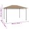 Belvédère 384x281x270 cm Taupe 180 g/m²Ce gazebo offre un excellent abri et est idéal pour les sports de plein air, les fêtes, les pique-niques ou tout autre événement en plein air. Cet auvent est doté d'une construction en acier solide pour une bonne stabilité. Le toit est en tissu avec revêtement PA, protégeant de la pluie et du soleil brûlant, pour que vous puissiez profiter pleinement des événements en plein air. De plus, cette tente d'extérieur est compacte et facile à ranger. Bon à savoir : Ce produit ne convient pas comme abri voiture. Tenez les enfants et les animaux domestiques à l'écart de la zone d'assemblage jusqu'à ce que le travail soit terminé. Certaines pièces peuvent présenter des arêtes vives, portez des gants de protection si nécessaire. Le gazebo doit être positionné et fixé uniquement sur une surface plane et horizontale. N'essayez pas d'assembler le gazebo dans des conditions venteuses ou humides. Ne placez pas votre gazebo dans une zone exposée à un vent excessif. Si vous utilisez des outils électriques ou une échelle, suivez toujours les instructions de sécurité du fabricant pour éviter les blessures. NE PAS utiliser de flammes nues dans le gazebo ou à proximité du pavillon. Les objets chauds tels que les grils récemment utilisés, les chalumeaux, etc. ne doivent pas être entreposés dans le pavillon de jardin. Fixez le gazebo à l'aide des piquets fournis.