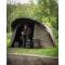 Tissu kaki avec armature verte, plus deux sangles pour cannes à l'avant de l'abri.