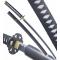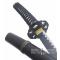 La lame est en acier deux tons. Garde en metal representant la tete du taureau noir. Manche en imitation peau de raie recouvert d'une tresse en coton noir. Fourreau en bois noir. Longueur totale : 103cm Longueur de la lame : 67cm Poids epee et fourreau : 970grs Poids epee sans fourreau : 780grs Superbe piece de collection.