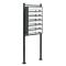 Dimensions par compartiment: 360 x 270 x 100mm Dimensions fente à lettres: 325 x 30mm Dimensions de la boite aux lettres: 695 x 385 x 270mm Dimensions du support : 1500 x Ø 49mm / 85mm Poids en kg 13,32 Matériau Acier galvanisé Couleur Anthracite / Blanc Épaisseur du matériau (en mm) 0,6 Application / Information / Caractéristiques Large fente de boite aux lettres 6 Boite aux lettres avec porte-nom 2 clés par compartiment Avec un pied de support pratique Revêtement par poudre robuste Boite aux lettres au montage simple Accessoires 1x boîte aux lettres 6x 2 clés 1x support 1x matériel de montage