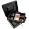 À l'intérieur de la mallette se trouve un insert avec cinq compartiments pour les pièces de monnaie ou les petits bijoux. La caisse peut être fermée à l'aide d'une clé.