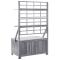 Boîte de rangement avec treillis Gris 99x55x160cm Acacia solideCette boîte de rangement polyvalente offre un espace de rangement et de la place pour vos plantes et fleurs. Cette boîte à coussins est faite de bois d'acacia massif, un bois franc avec des grains denses. Cette boîte magnifiquement conçue est stable, durable et accrocheuse. L'artisanat exquis et les beaux grains de bois rendent chaque pièce distinctive et légèrement différente l'une de l'autre. Le treillis intégré offre un excellent soutien pour les plantes grimpantes. Vous pouvez également placer un pot de fleurs sur les étagères. Les 4 étagères incluses peuvent être ajustées en position. Remarque : afin de prolonger la durée de vie des meubles d'extérieur, nous vous recommandons de les protéger avec une housse imperméable.