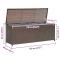Boîte de rangement de jardin marron 120x50x60 cm résine tresséeCette caisse de stockage de jardin en résine tressée sera idéale pour ranger et stocker les couvertures, les oreillers, les coussins, les livres et autres objets qui traînent dans le jardin ou sur le patio. Ce coffre de stockage dispose d'une doublure, ce qui la rend une solution idéale de rangement pour les coussins de votre mobilier de jardin et toutes sortes d'autres objets. Grâce à la résine tressée résistante aux intempéries, le coffre de rangement est facile à nettoyer, résistant à l'usure et adapté à une utilisation quotidienne à l'extérieur. La caisse dispose d'un cadre en acier laqué robuste, qui est extrêmement durable. La doublure en polyester protégera les contenus contre l'humidité. Remarque : veuillez couvrir la boîte à coussins par un tissu / un matériau imperméable pour empêcher la pluie d'entrer dans la boîte s'il pleut.
