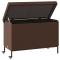 Boîte de rangement de jardin et roues marron résine tresséeCette boîte de rangement de jardin est idéale pour ranger vos coussins, oreillers, couvertures et autres objets dans le jardin ou sur la terrasse. Matériau durable : la résine tressée, également connue sous le nom de poly rotin, est un matériau synthétique solide et nécessitant peu d'entretien qui ressemble au rotin naturel. Elle est légère, facile à nettoyer et couramment utilisée pour les meubles d'extérieur en raison de sa durabilité et de ses propriétés de résistance aux intempéries.Fonction de rangement : le meuble de jardin dispose d'un espace de rangement en dessous, équipé d'un sac résistant à l'eau pour ranger les coussins, les jouets et d'autres objets. Le sac intérieur peut être solidement fixé au siège à l'aide de bandes auto-agrippantes, ce qui garantit la stabilité et empêche tout mouvement.Sécurité et facilité d'ouverture et de fermeture : le ressort à gaz facilite l'ouverture du couvercle et l'empêche de claquer ou de coincer les doigts.Facile à déplacer : ce coffre de rangement extérieur est équipé de deux roues avec freins, ce qui permet de le déplacer sans effort à l'endroit souhaité, tout en le bloquant en toute sécurité pour un meilleur contrôle et une plus grande sécurité. De plus, la poignée facilite le transport.Cadre robuste et stable : le cadre en acier enduit de poudre assure la solidité et la stabilité du meuble de jardin pour une utilisation quotidienne à l'extérieur. Bon à savoir :Pour que vos meubles d'extérieur restent beaux, nous vous recommandons de les protéger avec une housse imperméable.