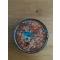 la peinture du dessous est très jolie, il y avait une étiquette sur le dessus mais elle est en mauvais état, il y a la peinture dessous , je pense que la boîte etait prévue pour un autre type de munitions d'où l'étiquette
