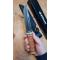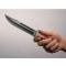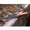 Sa lame en acier inoxydable 440A avec finition noire présente une forme Bowie caractéristique, avec une fausse arête (swedge) et une gorge prononcée. Cette géométrie permet des coupes efficaces pour le bois, le campement ou les travaux extérieurs.
