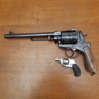 Revolver de haute qualité a neuf chambres pouvant acceuillir 9 cartouches de 32 20 wcf ou 8mn 92 grace a son barillet long . Guidon derivable pour la precision des tirs avec un maillet chasse goupille