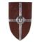 Ce bouclier médiéval en bois et acier pour une protection efficace et authentique. Conçu avec un cerclage et des traverses en métal riveté, il offre à la fois solidité et durabilité. Le revers est équipé d'une ceinture en cuir et d'une poignée en bois, assurant une prise en main confortable et sécurisée.