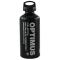 On peut la trouver sous deux appellations différentes mais on parle bien du même produit : bouteille à combustible ou bouteille à fuel. En version de 0,6 litre, la bouteille Optimus Tactical Black affiche un poids de 159 grammes, une hauteur de 217 mm et un diamètre de 73 mm. Elle possède donc un gabarit parfait pour une utilisation en randonnée et un transport en sac à dos. Le pas de vis au niveau du goulot est standard : il est compatible avec la grande majorité des réchauds multi-combustibles et marques disponibles sur le marché. Afin d'éviter toute erreur malencontreuse, l'appellation "bouteille de combustible" figure clairement sur la bouteille. Les recommandations d'utilisation sont également notifiées. Bon à savoir : la contenance totale est de 0,6 litre mais la contenance utile est de 530 ml (le niveau de remplissage maximal du fait de la pression du combustible est clairement indiqué).