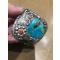 Magnifique bracelet manchette avec turquoise centrale et pierre de corail sertis sur argent sterling 925 sculpté - largeur 5,5cm
