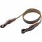 En cuir pleine peau. Avec renfort antidérapant vert pour éviter le glissement de l'épaule. Boucles gainées de cuir. Longueur : 105cm, réglable. Largeur : 2,5cm.