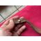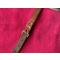 Bretelle ancienne en cuir, couleur marron claire, sur un côté cuir un peu craquelé ainsi que vers la boucle et le bas, quelques petites taches mais toujours fonctionnelle, longueur maximale : 85 cm, largeur du haut : 2,8 cm et sur le bas : 1,8 cm, pas de prix de réserve.