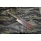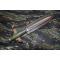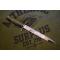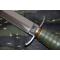Rare version personnalisée de la dague commando des TAP de l'Armée Française, longue lame à double tranchant de 19cm, épaisse de 5mm, poignée vert kaki, garde fine à double quillon, longueur totale 31cm, étui de ceinture en cuir épais MUELA, ensemble à l'état neuf, voir photos descriptives.