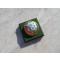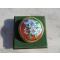 Broche ronde en émail sur cuivre a décor de fleurs et feuilles de couleur blanches et vertes sur fond rouge.