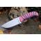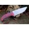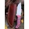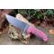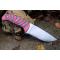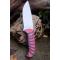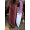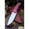 Couteau de chasse Bushcraft Survie à lame fixe - Longueur totale 21.5cm - Longueur de lame 11.5cm - Lame en acier carbone 1055 - Lame type drop point plain edge finition satin - Construction d'une seule pièce - Full tang - Plaquettes du manche en bois 3D Fushia/Green - Etui cuir - Fabrication artisanale