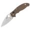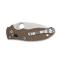 La lame et le manche sont reliés par le mécanisme breveté Ball Bearing Lock de Spyderco. Lorsque le couteau est ouvert, un piston pousse le roulement à billes vers l'avant sur une rampe sur la lame, la coinçant en toute sécurité. Manche en micarta marron poncé pour être lisse mais non polie. Les plaquettes du manche se patineront naturellement avec le temps.
