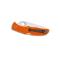 Lame lisse en acier VG10 à bord lisse affûtée au sabre . Manche en nylon et fibre de verre orange et texturé pour que le couteau ne glisse pas des mains.
